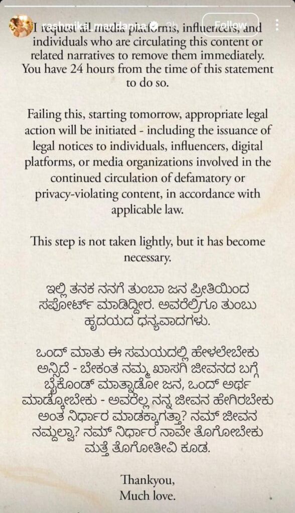 Rashmika also made it clear that failure to comply with the request could lead to legal action. According to her statement, she is prepared to take necessary legal steps against those who continue to circulate or promote the video.