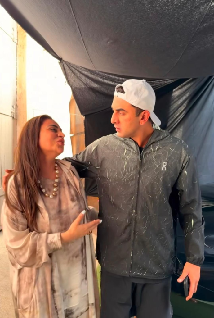 The behind-the-scenes photos showcased a relaxed moment from the sets. Ranbir Kapoor was seen dressed casually in a black shirt paired with shorts and a white cap, while Rimple Narula opted for an elegant off-white outfit. The post was accompanied by the song Tere Pyaar Mein from Ranbir’s film Tu Jhoothi Main Makkaar.