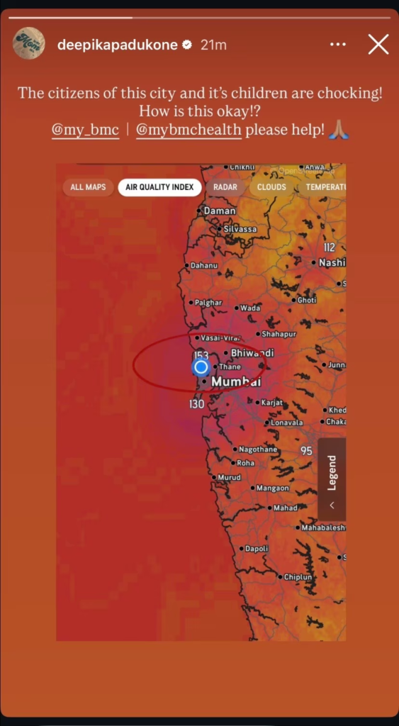 Taking to Instagram Stories, Deepika shared a screenshot of the city’s Air Quality Index (AQI) map, which showed high pollution levels across many areas of the Mumbai metropolitan region. Expressing her concern, the actor wrote: