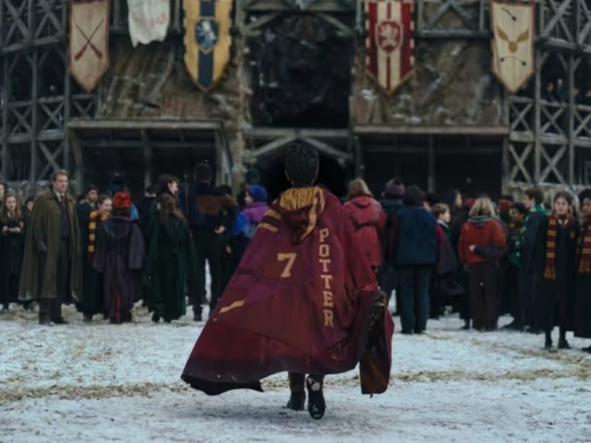 The newly unveiled poster transports fans to Hogwarts School of Witchcraft and Wizardry, even though Harry’s face remains unseen. In the image, Harry is dressed in his Gryffindor cloak, walking toward the Quidditch pitch on a snowy day, with his name and player number displayed on the back.