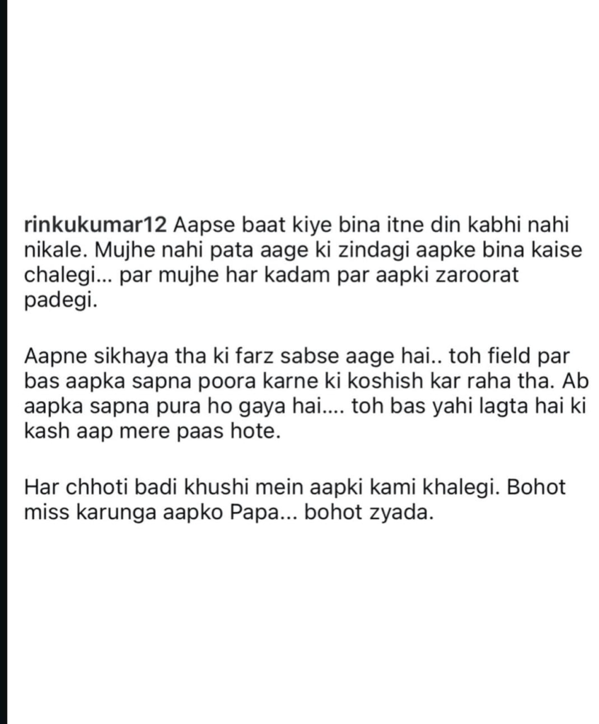 Rinku Singh’s touching tribute has resonated with many, highlighting the deep love and respect he had for his father and the void his passing has left in his life.