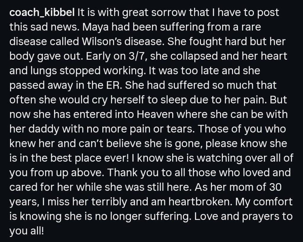 Maya’s mother, Kiyoko Kibbel, confirmed the heartbreaking news through an emotional message shared on social media. According to her statement, Maya passed away on March 7 after suffering complications related to Wilson’s disease.
