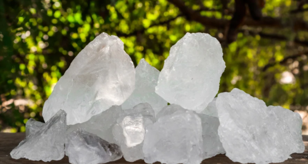 Fitkari, also known as potassium aluminum sulfate, is a mineral salt commonly used in traditional Indian households. It is often seen at barbershops where it is applied to minor cuts because of its astringent and antiseptic properties.