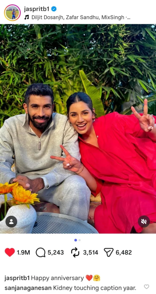 Responding to the post, Sanjana jokingly commented, “Kidney touching caption yaar,” playfully teasing Bumrah for his extremely short message. The humorous exchange quickly went viral, with fans enjoying the couple’s candid and affectionate banter.